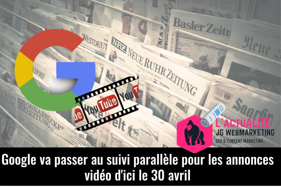 Google a annoncé aujourd'hui que la date limite pour adopter le suivi parallèle pour les campagnes publicitaires vidéo est le 30 avril. Le suivi parallèle pour les campagnes sur le Réseau de Recherche est entré en vigueur en 2018, cette annonce s'applique donc spécifiquement aux campagnes vidéo.